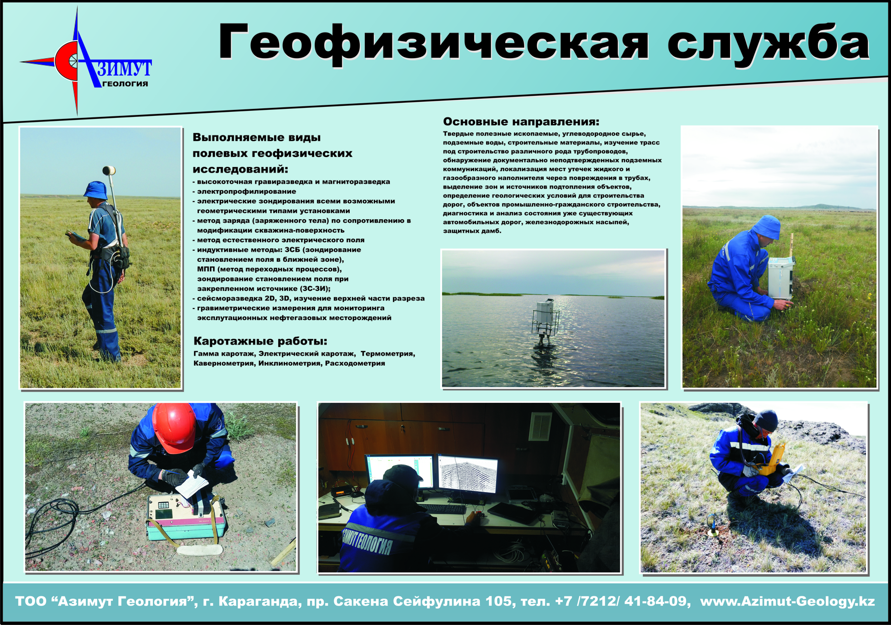 В последнее время в связи с постоянно увеличивающимися объемами промышленно-гражданского строительства одним из приоритетных направлений становится решение задач гидрогеологического направления: поиски и разведка надежных источников водоснабжения, определение уровня подземных вод, их минерализации и фильтрации; инженерно-геологического направления: определение мощности и состава рыхлых отложений, зон трещиноватости и закарстованности; проведение исследований на действующих промышленных и горно-геологических объектах с их широко развитой инфраструктурой. Поэтому, наряду с решением традиционных геологических задач, геофизическая служба ТОО "Азимут Геология" внедрила и проводит новые эффективные виды исследований, позволяющих в самых неблагоприятных условиях получать надежную достоверную информацию.