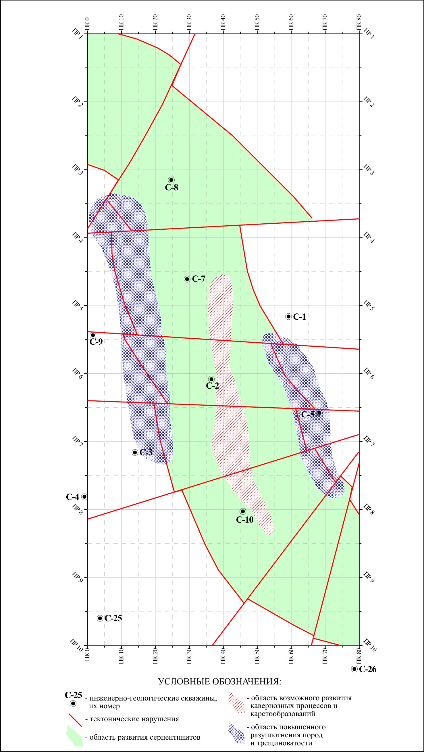 Следует отметить, что наличие такой сложной тектонической картины приводит к сильному разуплотнению пород и появлению ослабленных и трещиноватых зон также вдоль тектонических контактов северо-западного направления и тектонических нарушений северо-восточного направления.
