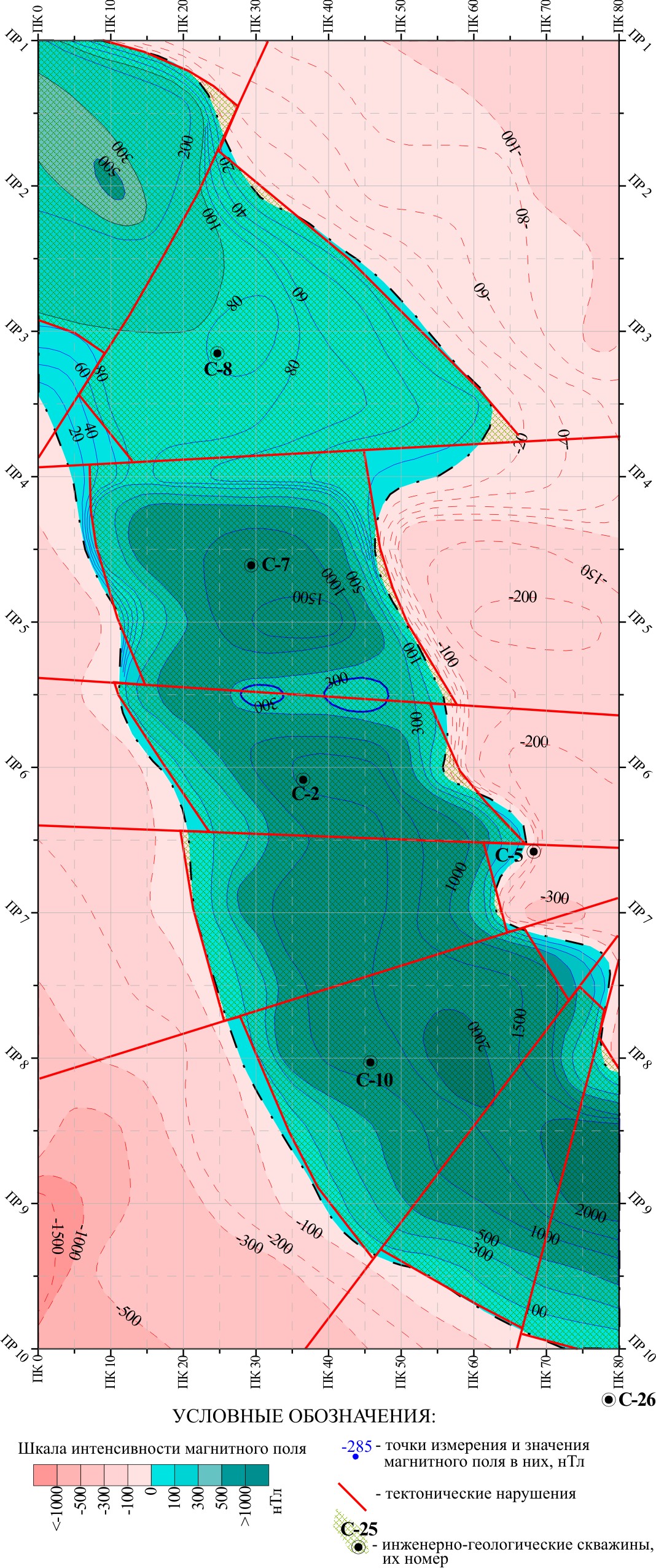 По результатам магниторазведки определены точные границы развития серпентинитов на участке работ и выделены многочисленные тектонические нарушения, в результате которых морфология его имеет сложную мелко-блоковую структуру.