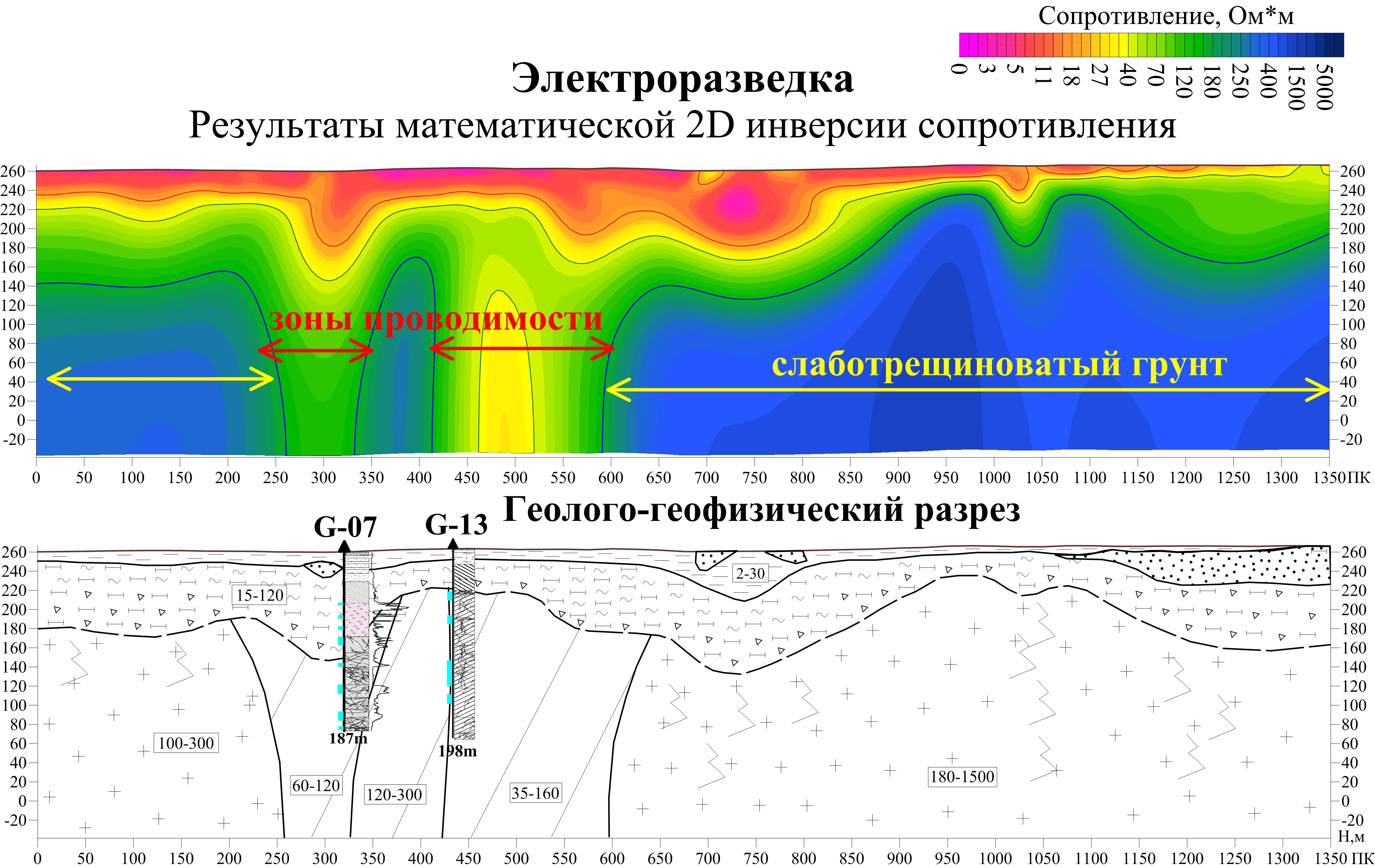 Пример из наших выполненных работ. Участок практически полностью перекрыт рыхлыми отложениями. По результатам геофизических работ, достаточно точно в разрезе определены литологические разности в виде глинистых отложений, коры выветривания, слаботрещиноватых пород и выделены две зоны проводимости, связанные с повышенной трещиноватостью и водонасыщенностью. В этих зонах были пробурены две поисковые гидрогеологические скважины. Дебит в скважинах составил 11,7л/c и 3.5л/c. Без геофизических данных, на данном участке ранее были пробурены малодебитные и “сухие” скважины.