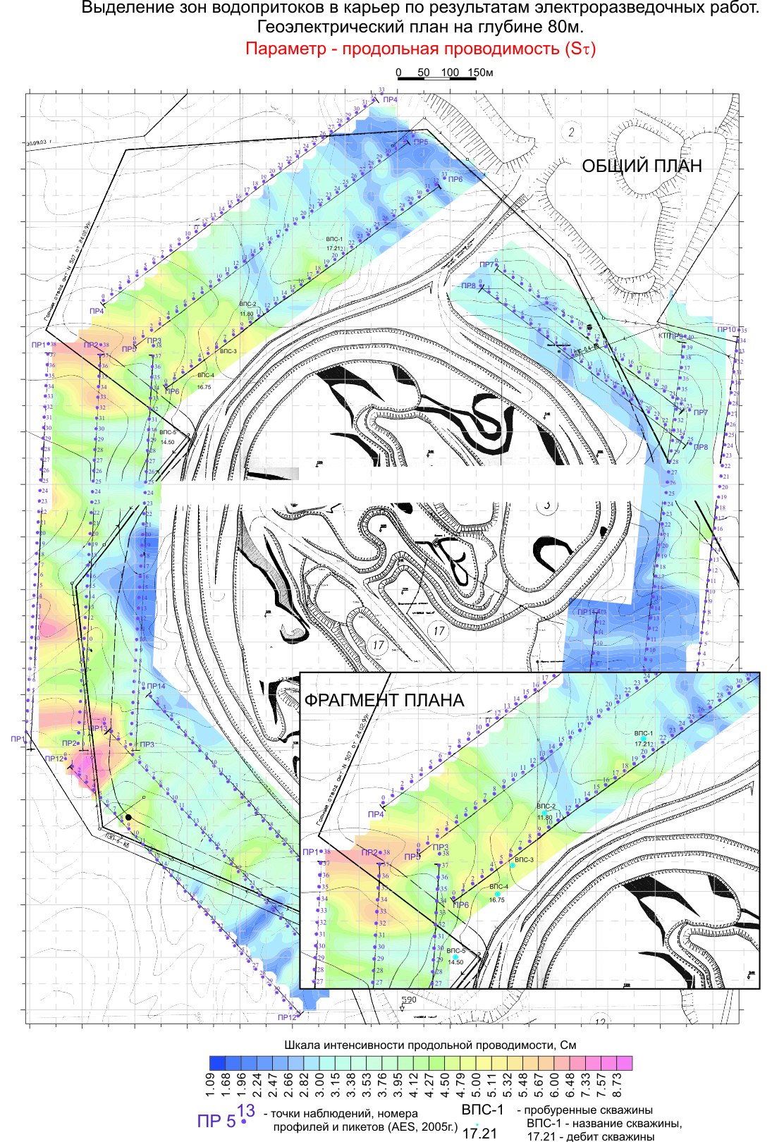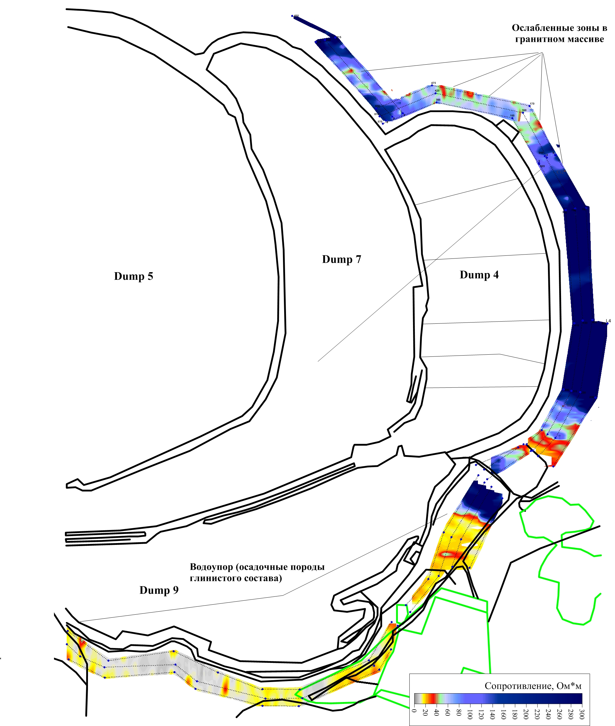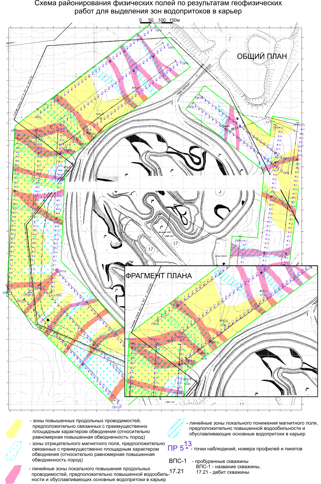 Схема районирования физических полей по результатам геофизических работ для выделения зон водопритоков в карьер. По результатам работ были пробурены поисковые скважины и даны дальнейшие рекомендации по осушению карьера.