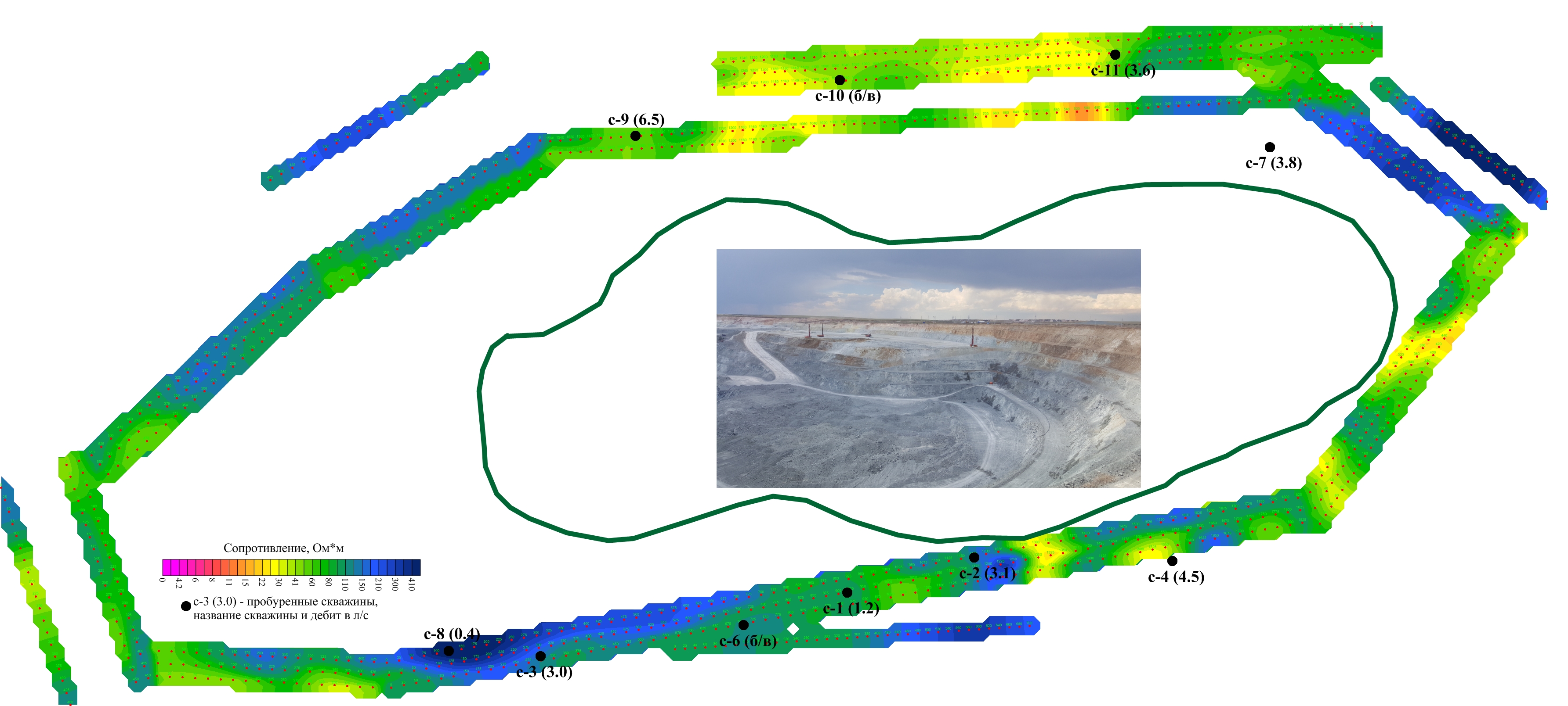 и рационального размещения буровых скважин на проектируемом карьере, были выполнены электроразведочные работы методом сопротивлений по методике электротомографии. По результатам электроразведочных работ были выделены ослабленные зоны и размещены и пробурены поисковые скважины, выполнены опытные и пробные откачки, рассчитаны водопритоки в карьер и даны рекомендации по бурению эксплуатационных скважин. Работы были выполнены полностью компанией ТОО "Азимут Геология" под ключ.