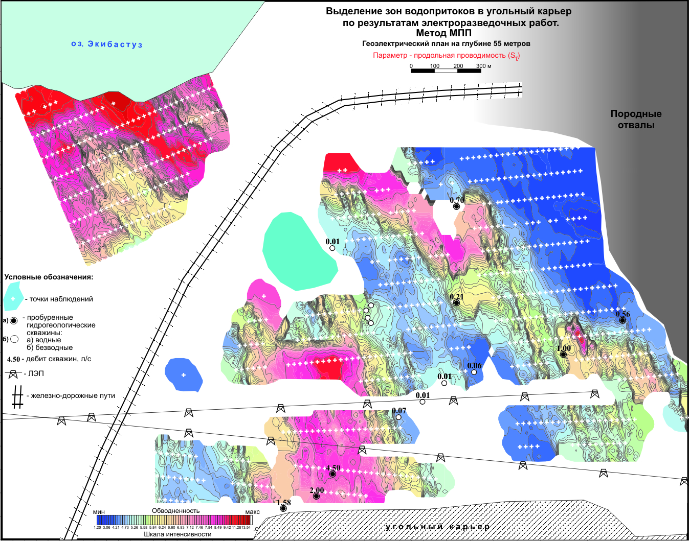 На одном из угольных карьеров г.Экибастуз были проведены электроразведочные работы методом ЗСБ (МПП, TDEM). Необходимо было ответить на вопрос - что является источником подтопления карьера подземными водами. В результате сложнейших работ в промышленной зоне карьера, несмотря на сильные помехи, были четко выделены и прослежены зоны максимального водонасыщения, берущие свое начало на берегах озера Экибастуз и протягивающиеся до карьера. Буровые работы, проводимые по результатам геофизических исследований, полностью подтвердили выводы геофизиков о причинах подтопления карьера.
