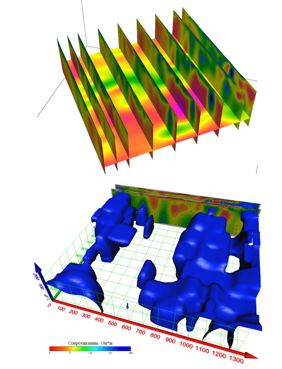 Объемное представление сопротивления. Высокоомное сопротивление связано со скальными слаботрещиноватыми горными породами.