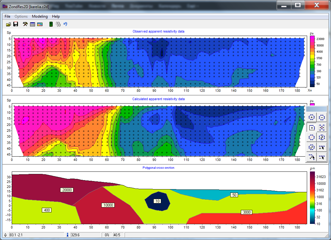 ZondRes2d представляет готовое решение для электрической томографии, и решает широкий спектр задач от математического моделирования, выбора системы наблюдений, анализа качества данных и чувствительности, до обработки и интерпретации полевых данных. Удобный интерфейс и широкие возможности представления данных позволяют максимально эффективно решить поставленную геологическую задачу. Система анализа качества данных электрической томографии позволяет быстро и эффективно выявлять проблемные измерения в автоматическом и полуавтоматическом режимах.