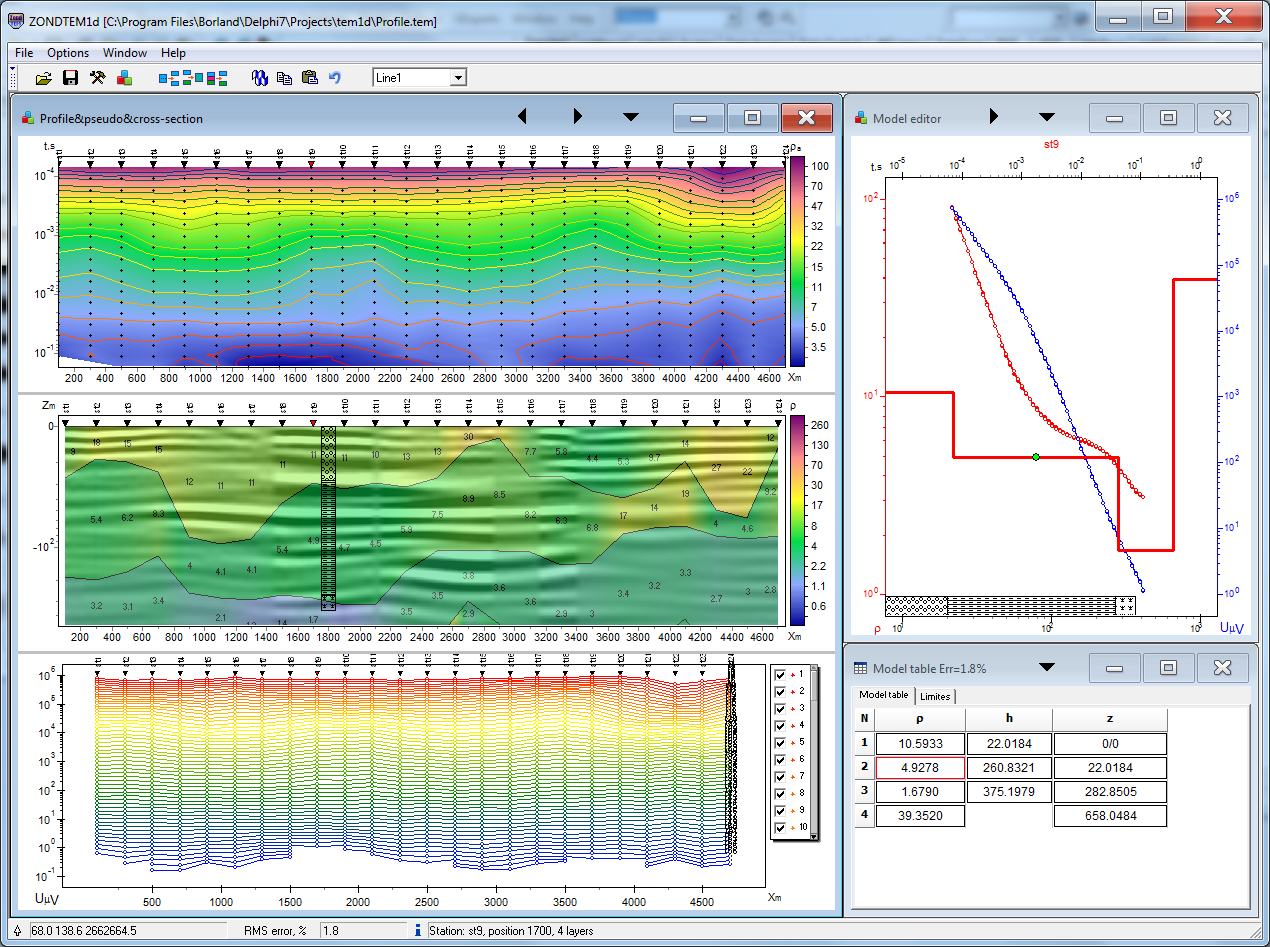 В основу программы ZondTEM1D положена концепция профильной интерпретации. Следовательно, профильные данные рассматриваются, как отражение геологического разреза по профилю в целом, а не как набор независимых кривых зондирования, с которыми работают по отдельности. В программе предусмотрены специальные алгоритмы, предназначенные для интерпретации профильных данных зондирования становлением поля, с подавлением P-эффекта кривой для электрических компонент поля. Конечно, большинство возможностей программы может быть использовано и при работе с отдельными точками зондирования становлением. В программе также реализован режим работы с площадными данными для произвольной системы профилей.