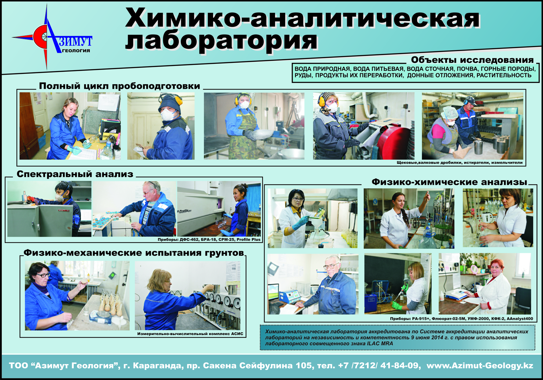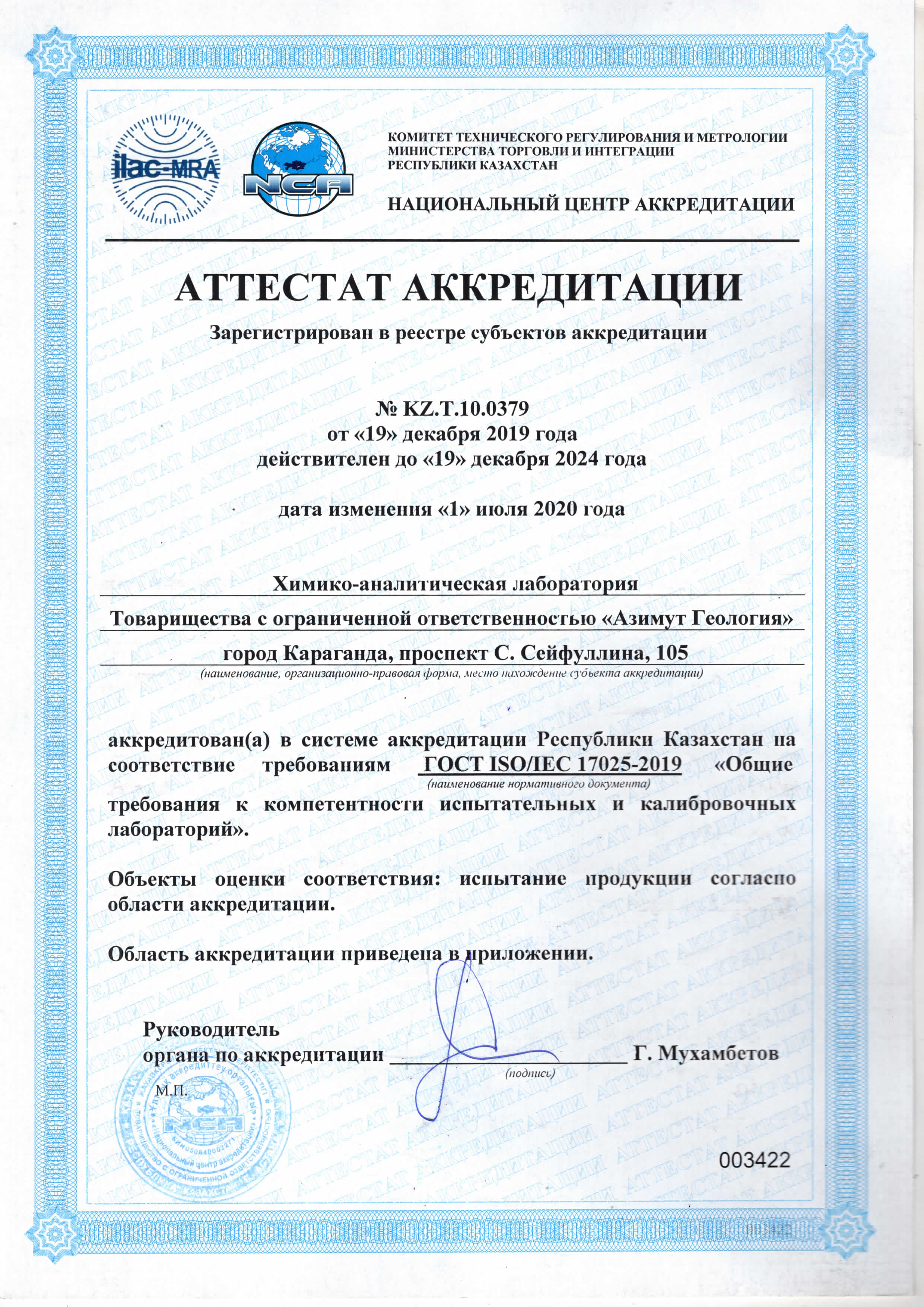 Химико-аналитическая лаборатория ТОО «Азимут Геология» аккредитована по Системе аккредитации аналитических лабораторий на независимость и компетентность 9 июня 2014 г. с правом использования лабораторного совмещенного знака ILAC MRA.