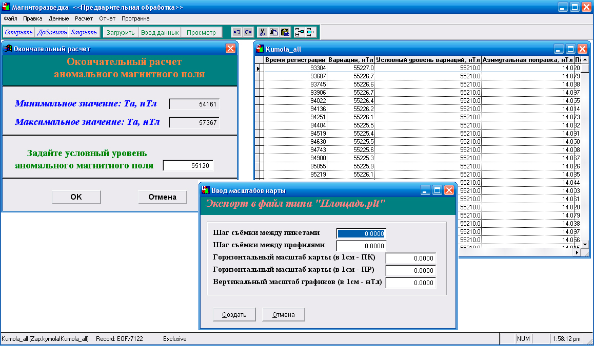 - экспорт в DAT файл. Программа экспортирует данных в формате ПРОФИЛЬ, ПИКЕТ, КООРДИНАТЫ и значение магнитного поля для построения карты изодинам.
