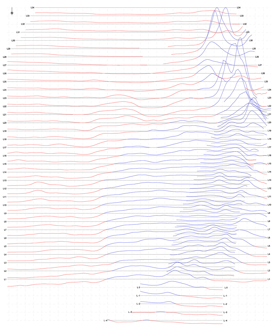 - экспорт данных по профилю в PLT файл. Программа автоматически определяет переход графика через ноль и строит график с учетом цвета плюс (синий) и минус (красный). Программа автоматически создает BLN файл для заливки графиков цветом плюс и минус