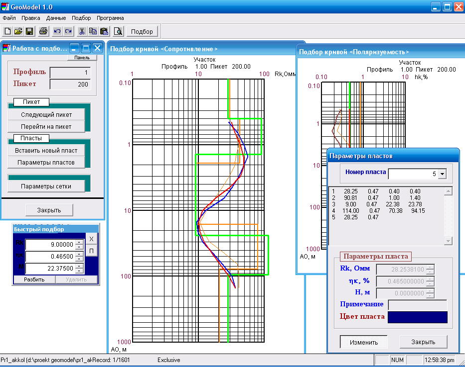 Исходные данные для подбора кривых хранятся в двух таблицах dbf. Первая таблица содержит данные по кривым ВЭЗ для всех пикетов по отработанному профилю. Данные могут быть импортированы из других таблиц или текстовых файлов. Вторая таблица содержит данные по результатам подбора (мощность пластов, сопротивление, поляризуемость и т.п.). Программа позволяет визуально отображать практическую и теоретическую кривую, пласты и их сопротивления. Доступ к пластам осуществляется с помощью метода "Click" "мыши" и через таблицу параметров пластов. После изменения любого параметра пласта производится пересчет теоретической кривой.
