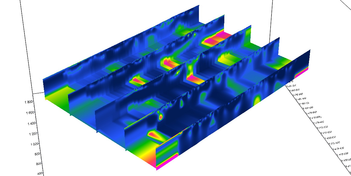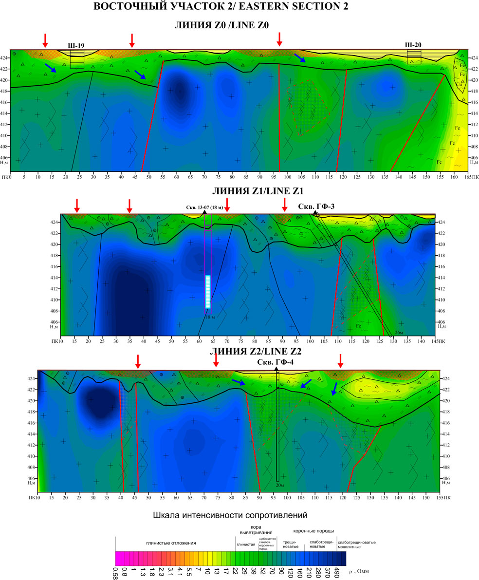 В последнее время электротомография используется нашей компании и на рудных объектах с регистрацией ВП до глубин 600-800м. Использование современной высокочувствительной аппаратуры позволяет получать достаточно качественные сигналы с глубин 600-800м, что особенно важно, чтобы не получить ложных аномалий, после чего все полученные данные передаются в ZondRes2D. При интерпретации глубинных разрезов, автором разработана дополнительная версия. Расчет ведется несколькими способами, с использованием различных алгоритмов инверсии и после получения нескольких моделей, априорной информации интерпретатор останавливается на окончательном варианте расчета.