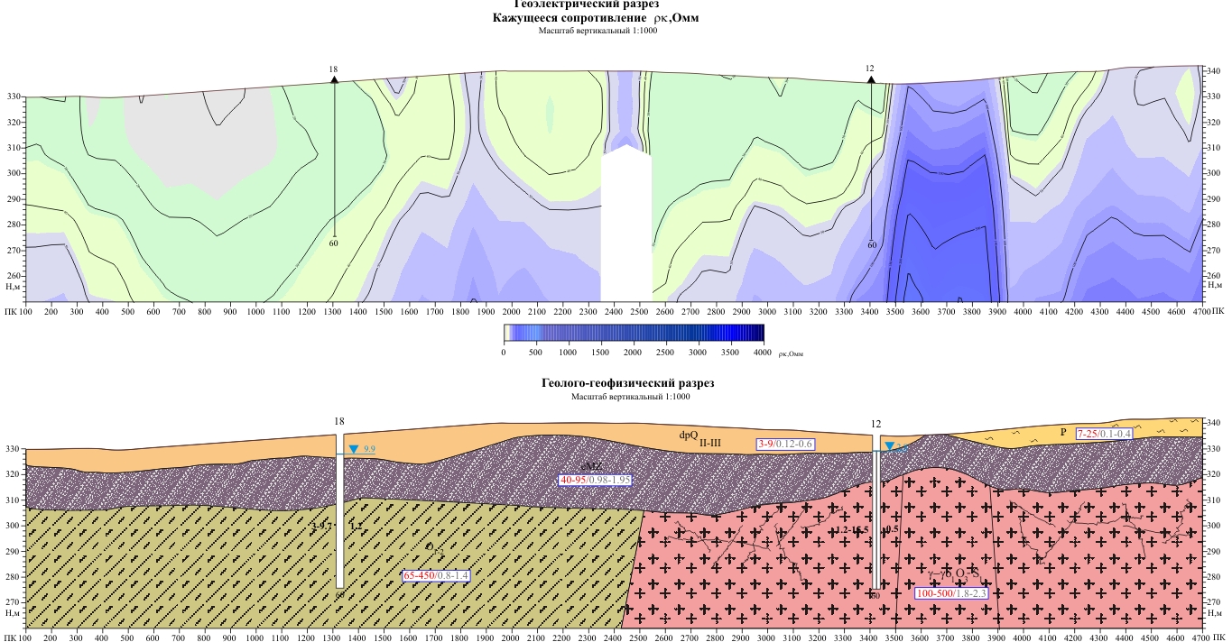 Достаточно плотные системы наблюдения данных позволяют получить практически идеальную модель сопротивления с использованием 2D инверсии, которая затем увязывается с геологической основой разреза. Полученная модель практически сразу позволяет решить ряд инженерно-геологических задач, которые ставятся перед геофизиками: