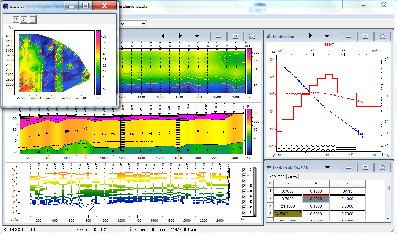 В основу программы ZondTEM1D положена концепция профильной интерпретации. Следовательно, профильные данные рассматриваются, как отражение геологического разреза по профилю в целом, а не как набор независимых кривых зондирования, с которыми работают по отдельности. В программе предусмотрены специальные алгоритмы, предназначенные для интерпретации профильных данных зондирования становлением поля, с подавлением P-эффекта кривой для электрических компонент поля. Конечно, большинство возможностей программы может быть использовано и при работе с отдельными точками зондирования становлением. В программе также реализован режим работы с площадными данными для произвольной системы профилей.