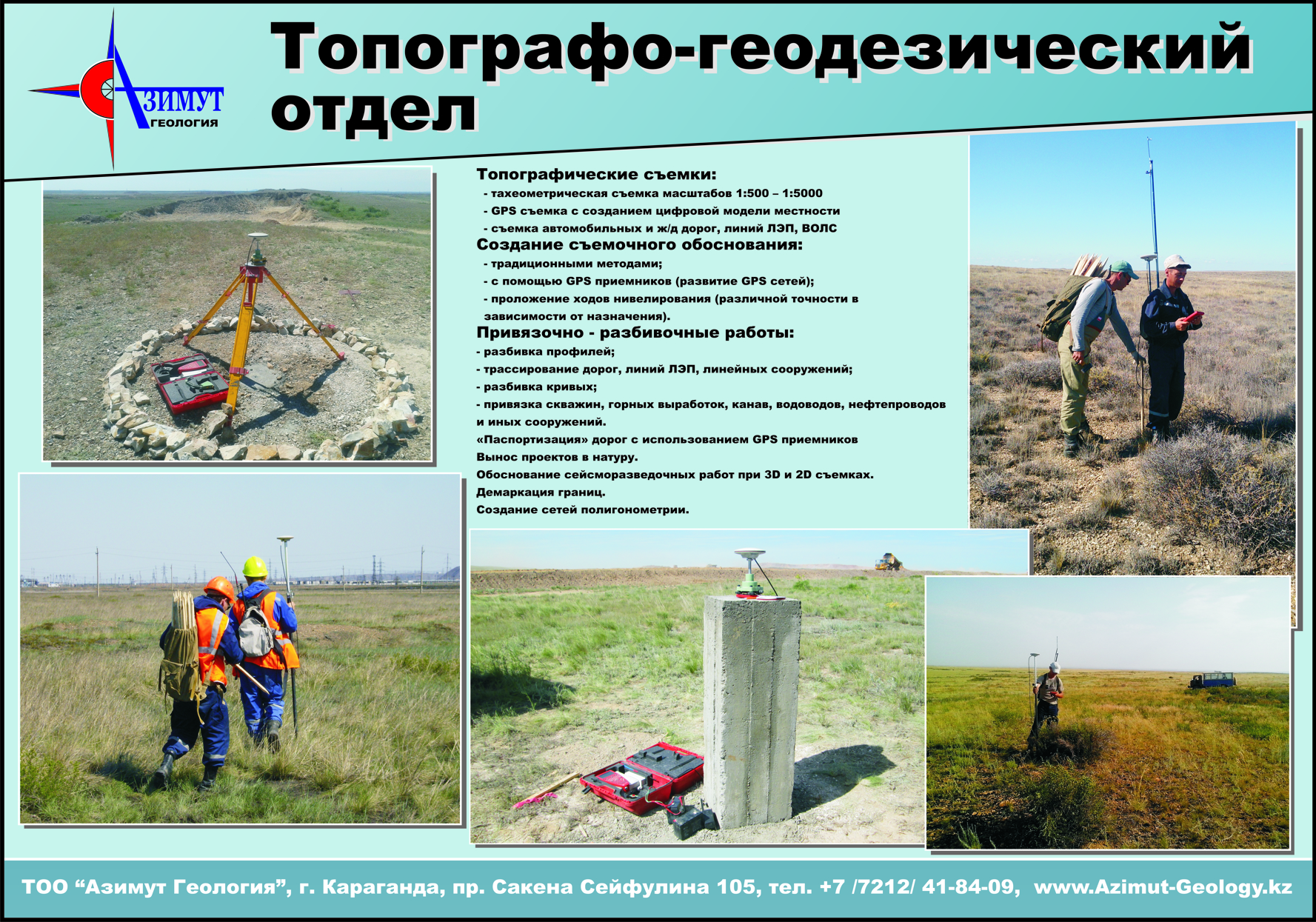 Высокое качество работ обеспечивается также использованием современного оборудования. ТОО “Азимут Геология” владеет вычислительным и множительным оборудованием, позволяющим быстро и качественно обрабатывать большие цифровые массивы и оформлять отчетные материалы в соответствии с современными требованиями.